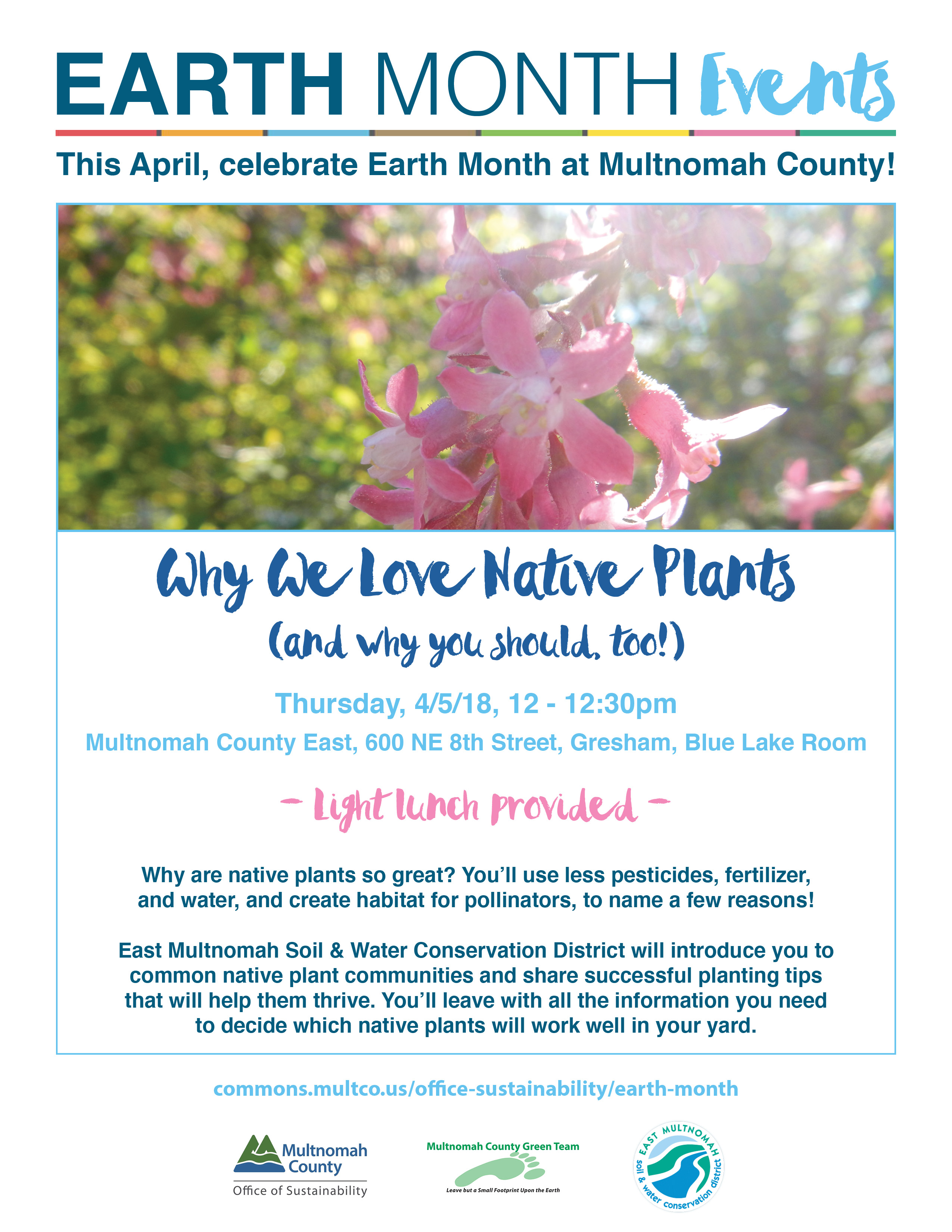 ¿Por qué son tan geniales las plantas nativas? Usarás menos pesticidas, fertilizantes y agua, y crearás un hábitat para los polinizadores, ¡por nombrar solo algunas razones! El Distrito de Conservación de Suelos y Aguas de East Multnomah te presentará las comunidades comunes de plantas nativas y compartirá consejos de plantación que te ayudarán a prosperar. Recibirás toda la información necesaria para decidir qué plantas nativas se adaptarán bien a tu jardín.