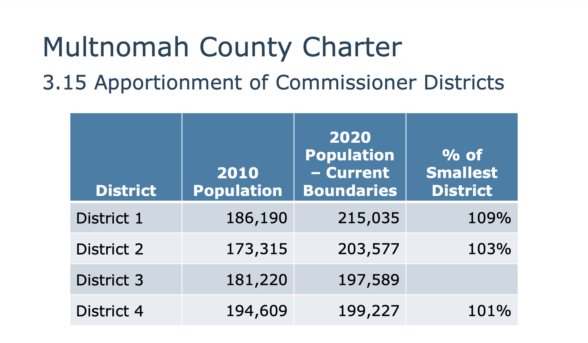 Para garantizar que estos distritos representen un número casi igual de personas, después de cada censo de EE. UU., la Carta del Condado de Multnomah requiere que el Auditor del Condado evalúe si alguna área ha crecido a más del 102 % de cualquier otro distrito.