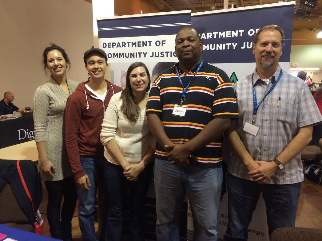 Michelle Aguilar, Mary Sullivan-Reinhardt, Bill Jeffreys, Harold Niblack, Kyle Schwab y Kelsey Urbina estuvieron presentes para responder preguntas, compartir información sobre oportunidades de voluntariado y empleo, y repartir agendas de bolsillo, credenciales y otros materiales. Varios veteranos tenían preguntas específicas sobre órdenes judiciales, supervisión y eliminación de antecedentes penales. Diane McKeel, comisionada del Condado de Multnomah del Distrito 4, también estuvo presente y se acercó a la mesa del DCJ para informarse sobre el estado de los veteranos presentes.