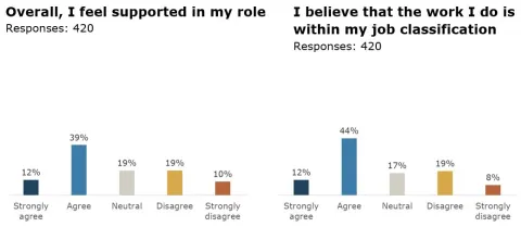 Overall, 51% of Library employees reported feeling supported in their role. Most Library employees responded that they believe the work they do is within their classification (56%), roles and responsibilities are clear to them (65%), and they have the tools they need to successfully do their job (63%).