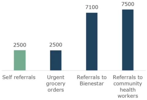 The county and its partners supported thousands of people during the pandemic. Between June 01, 2020 and January 31, 2022, the county placed approximately 7,500 referrals to community health workers working with culturally and linguistically specific communities. Bienestar de la Familia responded to approximately 7,100 referrals as well. The COVID-19 Call Center also coordinated approximately 2,500 orders for urgent grocery assistance, which is defined as a household needing food within the next five days. While the COVID Call Center attempts to track self-referrals to community-based organizations, information received about self-referrals is at times limited because some organizations do not report self-referrals to the county. Based on reports from community-based organizations as well as missing information, the number of self-referrals that community-based organizations assisted may be higher than reported to the COVID Call Center. Requests for assistance of all types appeared to increase during surges, particularly during the Delta and Omicron surges.
