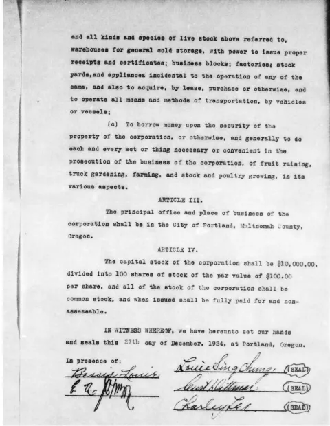 On December 27, 1924, three partners (Louie Sing Chung, Charley Lee & Curt Dittmar) incorporated the Louie Chung Gardens in order to cultivate, plant and produce fruits and vegetables and "kindred goods of every class and description, and to buy sell, import, export, and generally deal in the same." During the 1920s, Chinese people were still subject to federal and Oregon state exclusion laws which restricted or prohibited immigration, voting, and ownership of real estate. This excerpt from the Articles of Incorporation shows the purpose of the incorporation and the signatures of the three men involved.