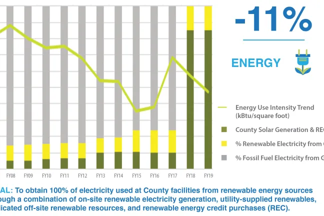 The County purchases green energy to offset fossil fuel derived energy and energy efficiency is improving over time.