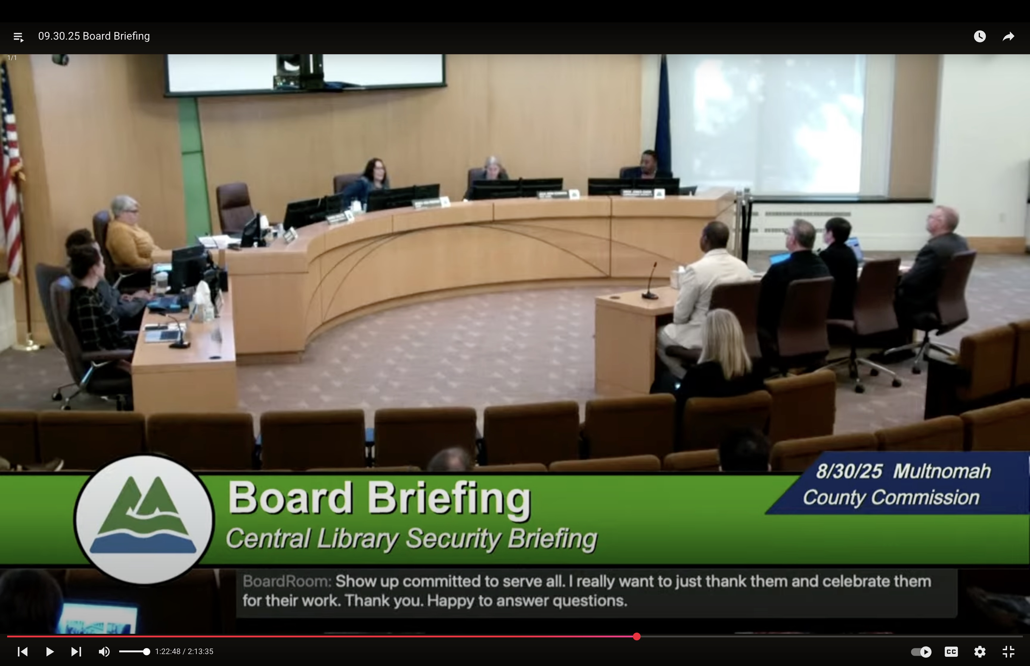 The Multnomah County Board of Commissioners heard updates on ongoing efforts to enhance safety and reduce security incidents at Central Library and surrounding areas.