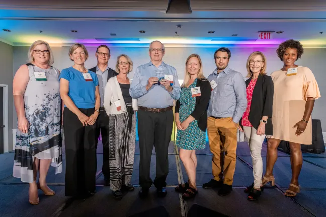 Project Manager JD Deschamps (center) poses with members of the courthouse project team, Portland Business Journal staff and other Transformer Award awardees.