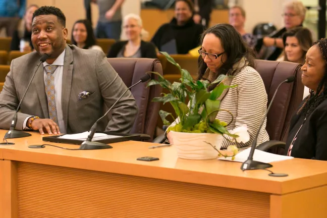 Pastor Deshawn Hardy addresses board at proclamation for his late father, as Rachel Banks (center) and Tameka Brazile (right) look on.