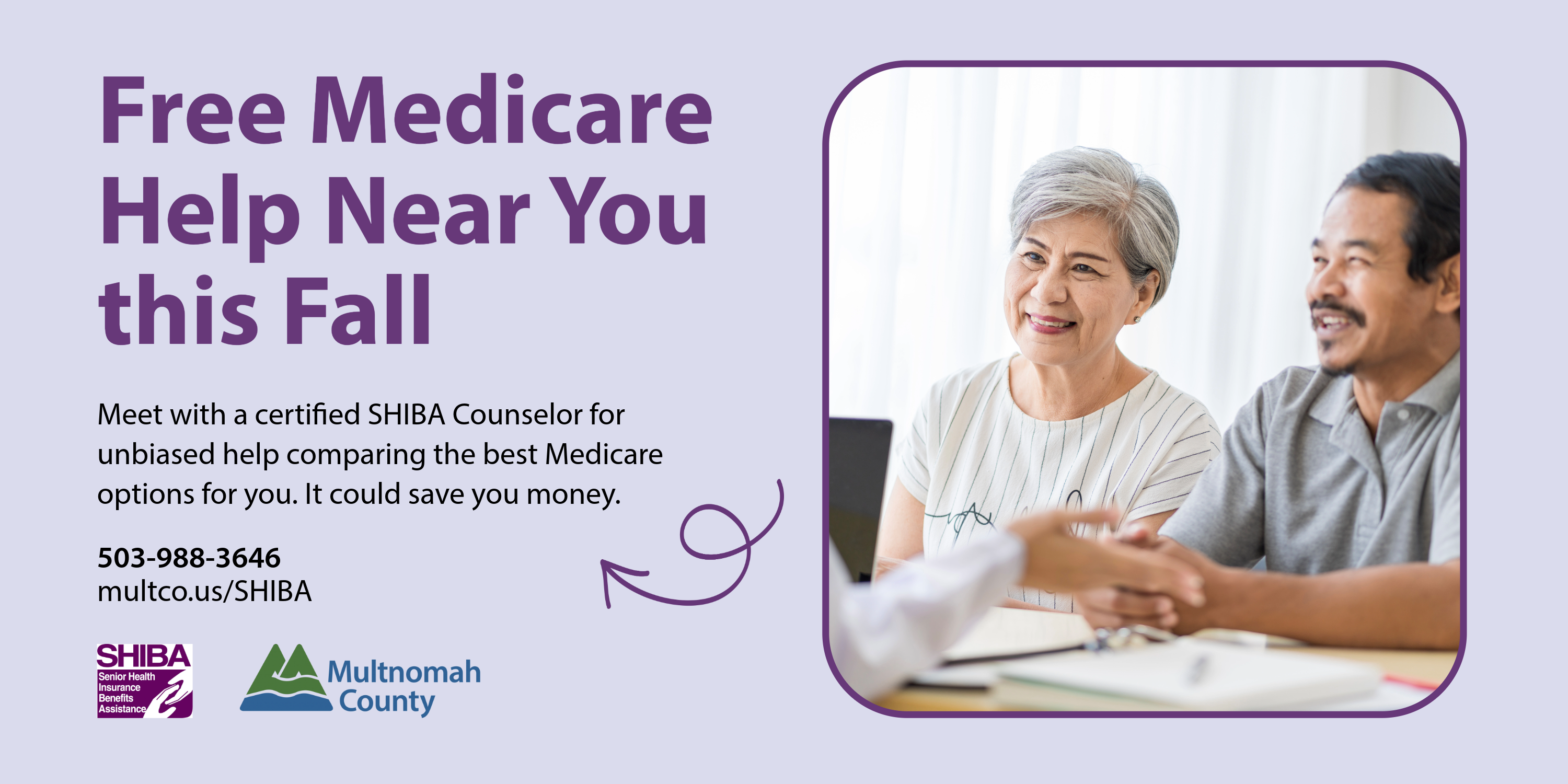 The Multnomah County SHIBA program is also an important resource to know about. The County provides free one-on-one counseling to help consumers understand their plan changes, identify major issues and compare their current coverage with the Medicare plans available in 2026. This assistance is free, unbiased and available to anyone on Medicare regardless of their income.