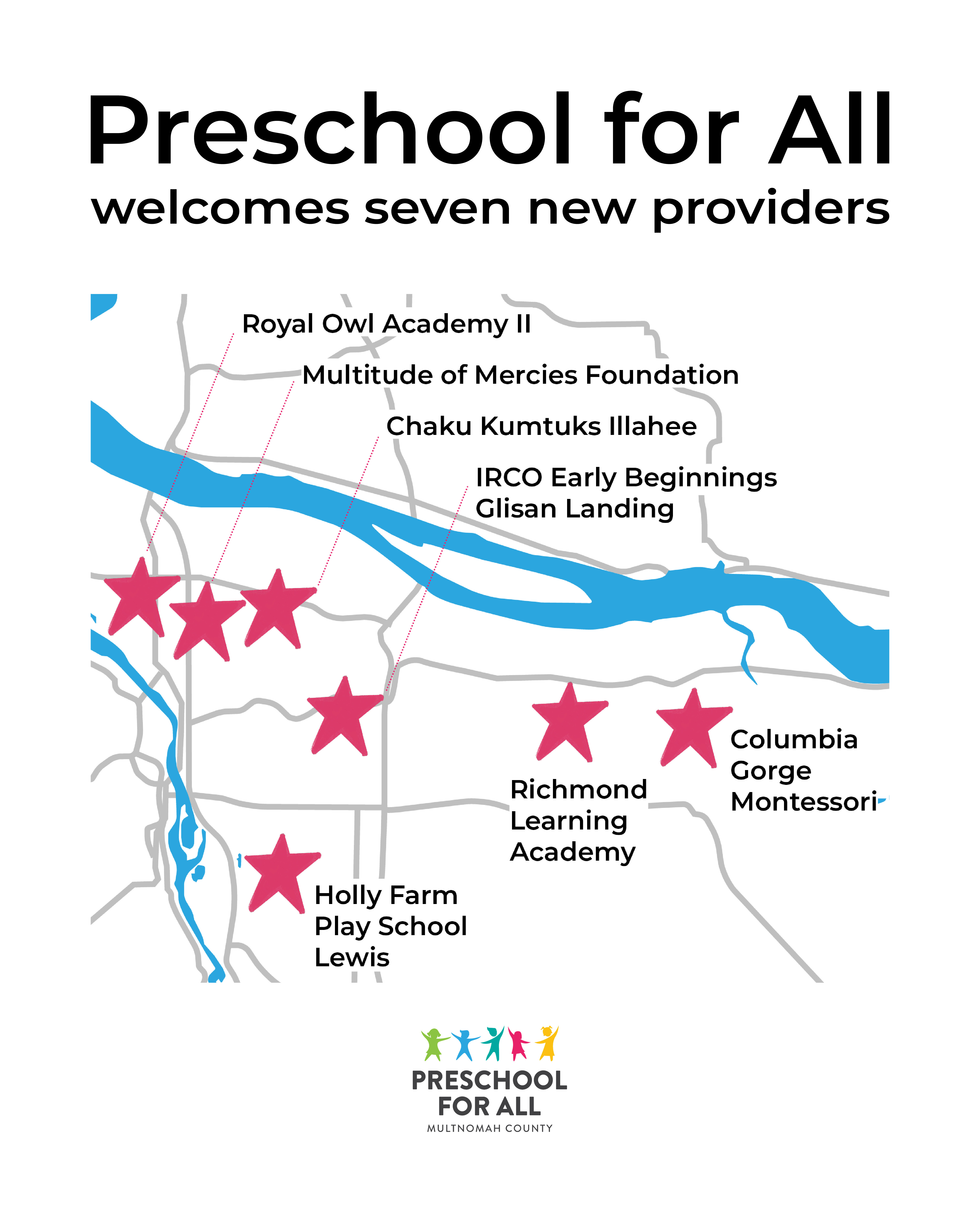 Families with eligible 3- and 4-year-olds in Multnomah County are encouraged to apply. There are no income eligibility requirements to apply for Preschool for All. To apply and learn more, visit pfa.multco.us.